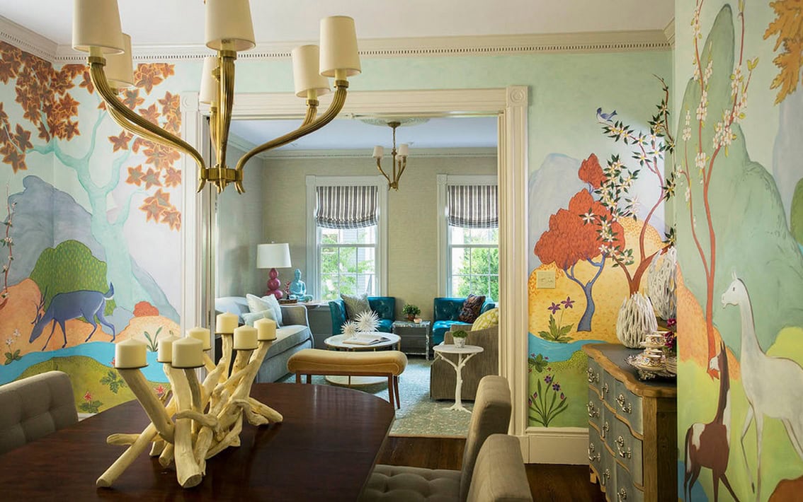 Look at this dining room in this Victorian house in Cambridge as it is colorful and cheerful: on the walls animals and plants of all kinds chase to tell a wonderful story.