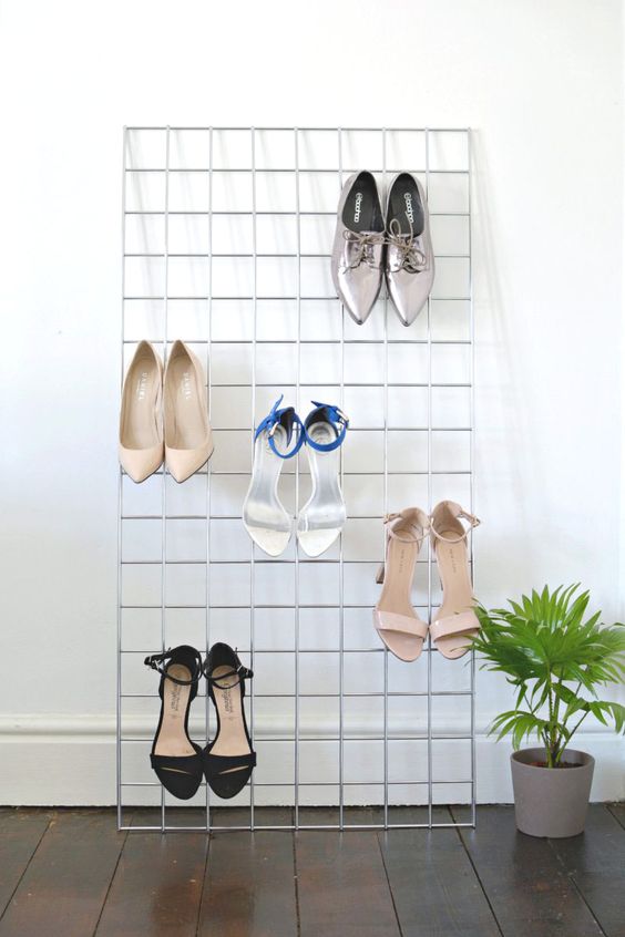Un’altra originale idea è usare un grigliato per appendere le scarpe, magari all’ingresso: fa sempre comodo avere un punto d’appoggio in entrata e uscita di casa.
