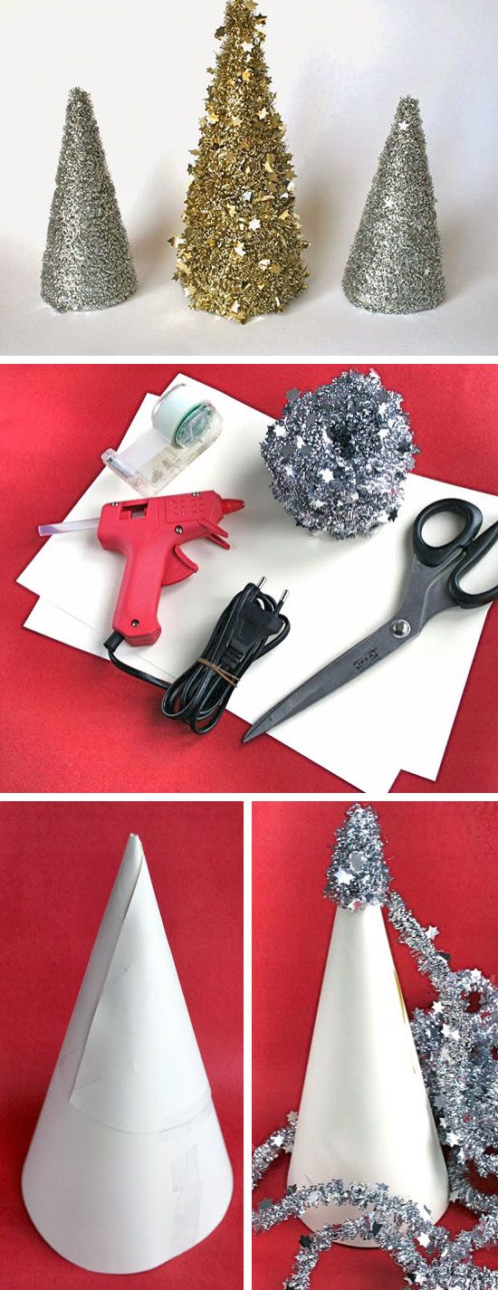 Con un pezzo di carta realizziamo un cono e poi incolliamo sopra i nastri glitterati che usiamo per decorare gli alberi. Con pochissima spesa avremo realizzato un centrotavola raffinato.
