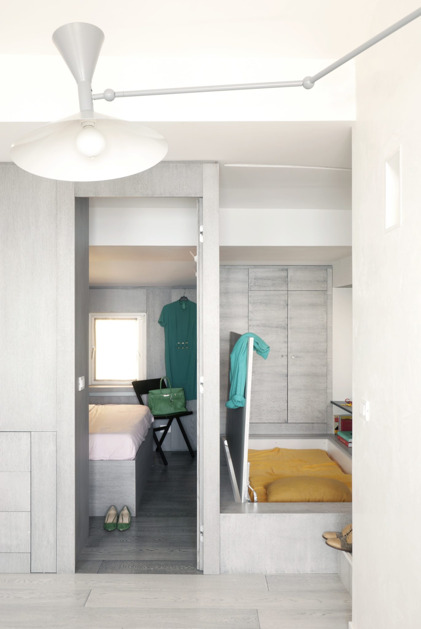 Vi ricordate la casa delle vacanze a Camogli, progettata dallo studio Gosplan? Un attico mansardato di 35 mq. Molti in questo spazio hanno solo la cucina e il soggiorno, mentre qui trovano posto la camera col letto matrimoniale e una piccola camera con un letto singolo. Ma dov’è questo letto?