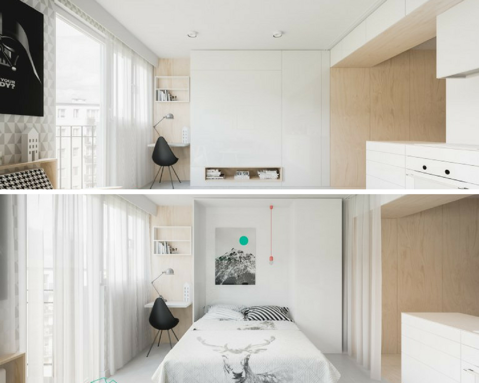 Continuiamo con un altro progetto di Piotr Matuszek e Gosia Czarny (un genio nel progettare spazi micro), in Polonia. Scendiamo a 20 mq: pazzesco. Eppure guardate le foto: ogni elemento trova il suo posto, perfettamente ad incastro con tutto il resto. Secondo voi dove sono gli armadi?