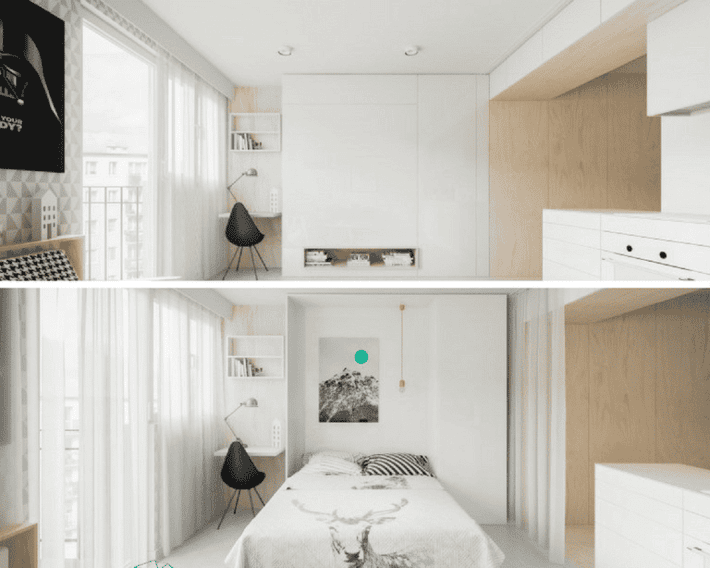 Questa è la soluzione principe per chi vive in un monolocale ma non vuole proprio sentir parlare di divano letto. Se solo l’idea del divano letto vi urta i nervi, allora il letto matrimoniale a scomparsa nella parete attrezzata è quello che fa per voi. Pochi gesti per far apparire e sparire il letto, che rimarrà completamente nascosto quando non serve.